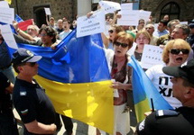Одновременно националистическая партия "Атака" проводила пророссийскую акцию, направленную в том числе в поддержку постройки газопровода "Южный поток".