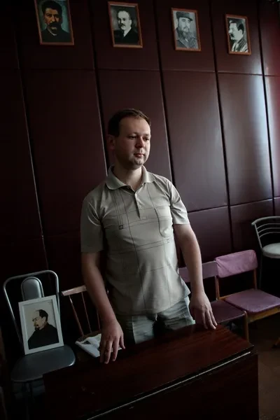 Офис пермского отделения организации Кургиняна «Суть времени» — маленькая комната в дешевом офисном здании на окраине Перми. На темно-красной стене, в ряд: Дзержинский, Ленин, Молотов, Мао, Фидель и два Сталиных (фас и профиль). Сегодня здесь День открытых дверей, но на него приходим только мы, активист «Сути времени» Павел — герой фильма НТВ — и пожилой мужчина.
