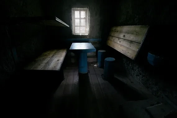 Кукушкин ведет нас в барак особого режима. Длинный темный коридор с синими стенами, бесконечные камеры-клетки с железными табуретами, деревянными, откидывающимися на день койками и шубой — грубо набросанными острыми кусками цемента, не позволяющими опереться… Цемент, железо, бетон. Снаружи жарко, но внутри очень холодно, и шаги охранника глухо шаркают по коридору.