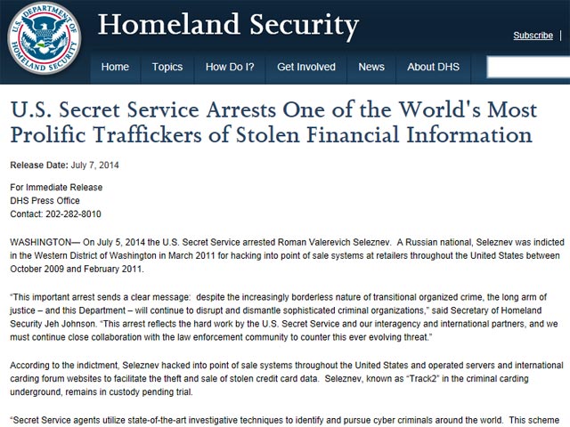 Отметим, что российские СМИ и раньше писали про сына Валерия Селезнева по имени Роман. В 2011 году молодой человек Как сообщили МНБ и Секретная служба, с этой целью россиянин проникал в платежные системы предприятий розничной торговли в США, внедряя в их компьютеры вредоносные программы. По мнению следователей, он контролировал работу нескольких серверов по всему миру, а также создал и поддерживал в интернете ряд специальных форумов, где шла торговля "украденной информацией о кредитных картах". В марте 2011 года в суде штата Вашингтон против него были заочно выдвинуты обвинения по 29 пунктам, по совокупности которых ему может грозить тюремное заключение на несколько десятков лет и штраф на миллионы долларов. Кроме того, в штате Невада против него заведено уголовное дело по подозрению в причастности к преступной группировке, занимавшейся вымогательством. "Этот человек и другие транснациональные преступные группировки нанесли финансовой инфраструктуре США существенный вред, размеры которого нельзя недооценивать", - заявила директор Секретной службы Джулия Пирсон. Ее ведомство, созданное в свое время при Министерстве финансов, по традиции - помимо охраны высших должностных лиц государства - продолжает заниматься в США борьбой с финансовыми преступлениями. По подсчетам Министерства юстиции, "мошенничество с кредитными картами ежегодно наносит американским финансовым организациям ущерб на сумму 40 млрд долларов". В то же время прокурор Западного округа штата Вашингтон Дженни Даркэн отметила в понедельник, что задержанный гражданин России пока считается лишь подозреваемым и принцип презумпции невиновности будет оставаться в силе до тех пор, пока и если выдвинутые против него обвинения не будут убедительно доказаны в суде. Российское гражданство у хакеров - не редкость Ранее российские хакеры неоднократно обвинялись в совершении киберпреступлений в США. Так, месяц назад Министерство юстиции Соединенных Штатов обвинило хакера из Анапы Евгения Богачева в атаках на банковские системы и попытке хищения миллионов долларов с помощью программ GameOver Zeus и CryptoLocker. В начале года россиянин Александр Панин, представший перед американским правосудием, признал свою вину в написании вредоносной программы SpyEye, с помощью которой группа хакеров из Восточной Европы сумела похитить более 70 млн долларов. Тогда же американские власти обвинили жителя Саратовской области Рината Шибаева в создании вируса "Картоха", похитившего данные 110 млн банковских карт в США Еще один россиянин, Алексей Белан, фигурирует в списке десяти самых опасных преступников, разыскиваемых ФБР. Его фотография фигурирует на первом месте, а за помощь с поимкой обещана самая крупная награда - 100 тысяч долларов. Добавим, по данным недавнего исследования, за последний год хакеры смогли получить доступ к персональным данным 47% взрослого населения Соединенных Штатов, в том числе в распоряжении преступников оказались 430 млн аккаунтов на различных интернет-сайтах. Больше всего пострадали клиенты торговой сети Target, из компьютерных сетей которой похищены данные 70 млн человек. Специалисты объясняют рост числа атак развитием интернет-торговли.