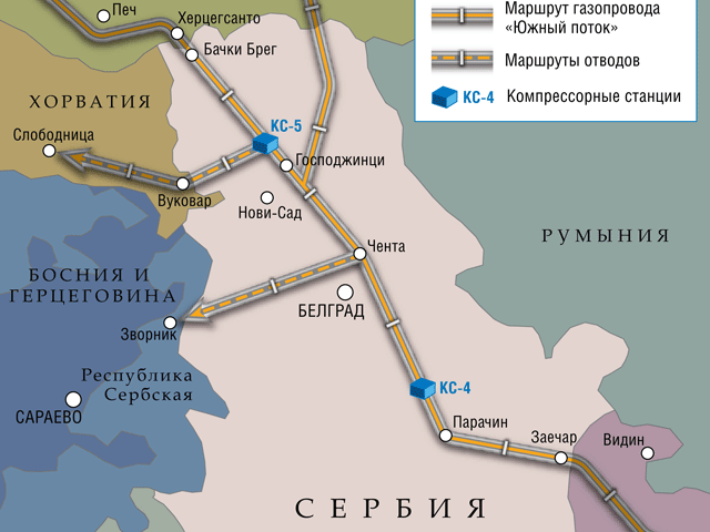 Сербия рассчитывает стать региональным энергетическим узлом благодаря "Южному потоку". С территории Сербии планируется сделать два отвода - в Республику Сербскую и Хорватию, рассматривается возможность отвода в Македонию вместо того, чтобы делать его с территории Болгарии.