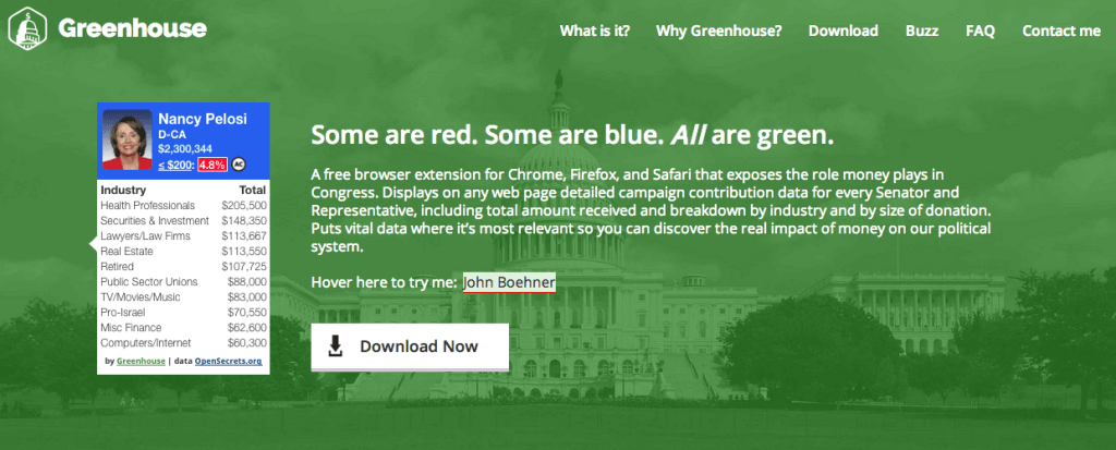Greenhouse показывает доходы и расходы любого человека в Конгрессе США, независимо от партии. Данные для плагина были получены автором из открытого ресурса OpenSecrets.org.