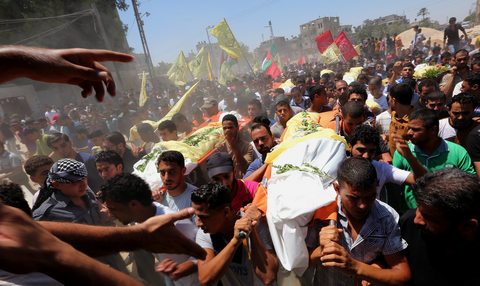 3. Palestinian relatives and friends of the Kawarea family carry seven bodies during their funeral in Khan Yunis refugee camp, southern Gaza Strip, 09 July 2014.