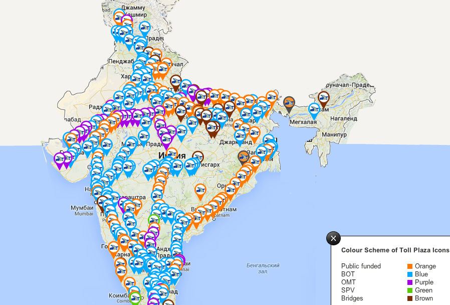 Ресурс является картографическим, и вся информация нанесена на карту Индии в виде меток. При нажатии на метку можно ознакомиться со стоимостью проезда в зависимости от типа транспорта, а также получить сведения о протяженности участка платной дороги и узнать другую важную информацию.