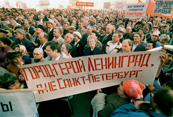 © ИТАР-ТАСС Митинг против переименования города Ленинграда, 1990 г. А по поводу Санкт-Петербурга Горбачеву было выгодно использовать те настроения, которые существовали в обществе, нарушить баланс сил и дать понять всем в 1990—1991 году, что мы можем даже это. Первичные социологические опросы показывали, что население Ленинграда разделено ровно пополам. Мы в СФК предложили провести просветительскую работу с жителями. Лихачев все время подчеркивал очень важную мысль: Санкт-Петербург назван не в честь Петра I, а в честь его небесного покровителя. Таким образом подчеркивалось, что Санкт-Петербург — это не мемориальное название. И вот был объявлен референдум о возвращении городу исконного имени — Санкт-Петербург. Он проходил в Ленинграде одновременно с референдумом 1991 года, 12 июня, в один день с выборами президента России и мэра города. Жителям города на Неве был задан вопрос: желаете ли вы возвращения нашему городу его первоначального названия — Санкт-Петербург? В голосовании приняло участие около 65 процентов ленинградцев. Результат таков: более половины из них — около 55 процентов голосовавших — высказалось за возвращение городу его исконного имени. 6 сентября 1991 года Верховный совет Российской Федерации утвердил указ о возвращении городу Ленинграду исторического названия Санкт-Петербург. После этого в Петербурге, как писали СМИ, начались массовый демонтаж памятников Ленину и советским вождям, переименование улиц и площадей.