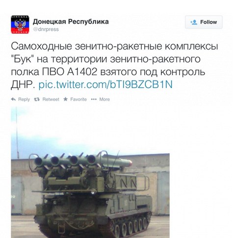 Территория Тореза, где предположительно упал самолет, контролируется силами самопровозглашенной Донецкой народной республики, однако ее руководство отрицает свою причастность к падению малазийского самолета, сообщает «Интерфакс» со ссылкой на члена Совбеза непризнанной республики Сергея Кавтарадзе. В твиттер-аккаунте ДНР уже начали пропадать записи о наличии у самопровозглашенной республики на вооружении «Буков». Напомним, что представители ополчения 29 июня взяли под контроль воинскую часть №А-1402 противовоздушной обороны в Донецке с зенитно-ракетными комплексами «Бук». После сегодняшней катастрофы, в частности, был удален вот этот твит: