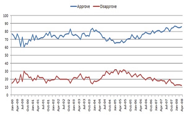 Популярность президента России Владимира Путина среди россиян достигла самого высокого уровня за последние годы. Об этом свидетельствуют данные опроса, проведенного американским центром исследования Gallup. 83% граждан России, принявших участие в опросе, заявили об одобрении решений Путина — таковых за последний год стало на 29% больше. Причину роста популярности российского президента авторы исследования объясняют «национальной гордостью россиян в связи с присоединением Крыма в марте 2014 года после успешной Олимпиады в Сочи месяцем ранее». Впервые с 2008 года большинство россиян (73%) полагают, что руководство страны избрало верный курс. Несмотря на санкции со стороны США и Евросоюза, растет число россиян, считающих, что экономика страны на подъеме, боеспособность государства растет (78%), а выборы в стране честные (39%).