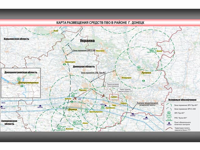 На пресс-конференции накануне в Минобороны РФ сообщили, что Boeing, находясь над Донецкой областью, отклонился от коридора воздушной трассы и оказался на 14 км севернее. По данным военного ведомства, пролетев мимо Горловки, лайнер попытался вернуться на маршрут, но до границ своей воздушной трассы добраться не успел.