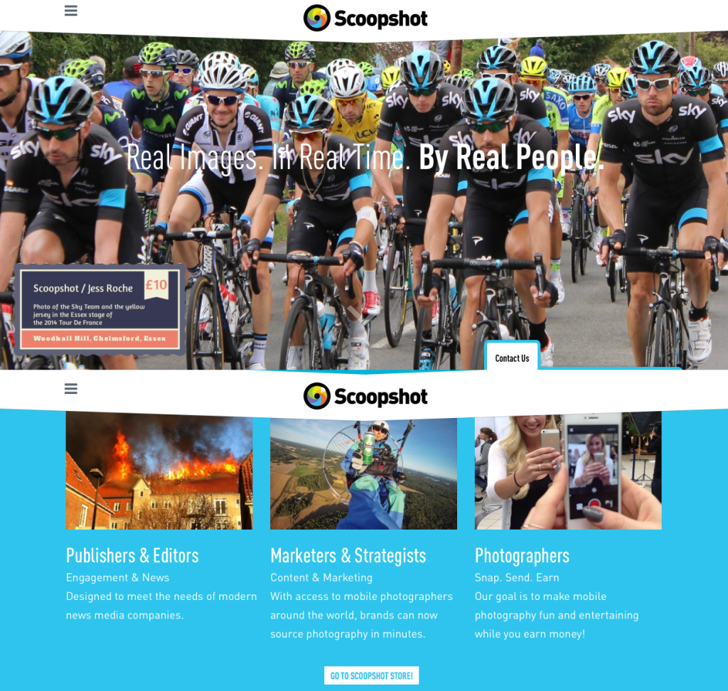 Платформа помогает ответить на возросший спрос на свежий и оригинальный визуальный контент, который показывает мир глазами людей. Scoopshot представляет набор инструментов для маркетологов, рекламодателей, дизайнеров и брендов, которые позволят снизить расходы компаниям на поиск хорошего контента.