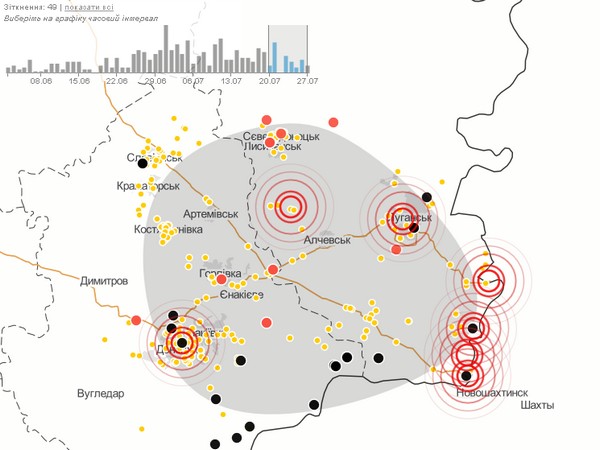 В соседней Луганской области Украины, где тоже ведутся активные боевые действия, только за 25 июля в результате вооруженных столкновений между силами АТО и ополченцами погибли девять мирных жителей, еще 41 человек ранен. Были обстреляны Артемовский, Жовтневый, Каменнобродский и Ленинский районы, 22 здания, в числе которых жилые дома, школы и детский сад были повреждены. По информации ополченцев, минометному обстрелу в пятницу подвергся и автовокзал Луганска. В результате, как они заявляют, погибли 15 мирных жителей и около 60 получили ранения, излагает их версию РИА Новости. Украинские источники говорят об обстрелах Луганска сторонниками самопровозглашенной ЛНР.
