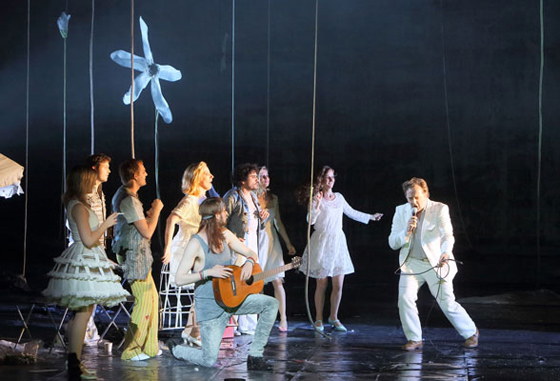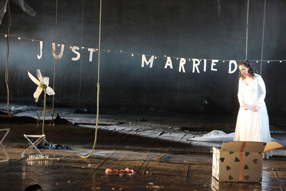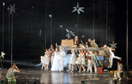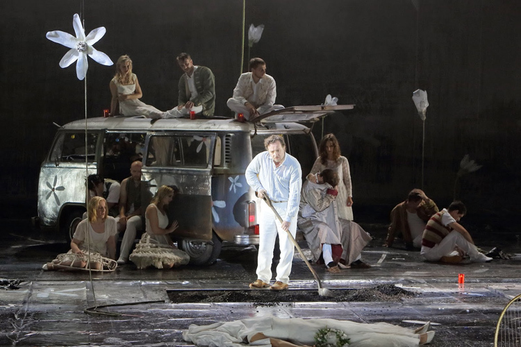 © Bavarian State Opera Сценическое решение оказалось типичным для Бёша: он вместе с художником Патриком Банвартом создал внутри классической черной коробки, украшенной неопрятными подтеками, бесприютное пространство, продуваемое всеми ветрами вечности. Выползшие из-под сморщенных пластиковых мешков трогательные цветочки тянутся к небу длинными стеблями, но неба нет — лишь чернота. Жизнь — временное недоразумение, случайная плесень на теле Земли. И даже развеселая хиппующая толпа гостей, прибывшая на молодежную свадьбу на насквозь проржавевшем уазике, не может развеять онтологический мрак.
