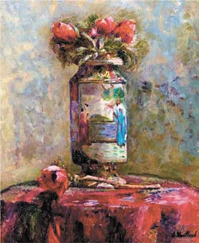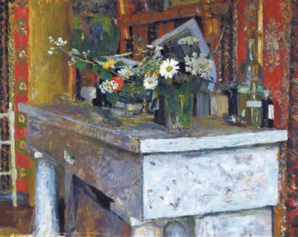 Серая гладкая облицовка камина выделяется на фоне темно-красных обоев с узорами; на камине — цветущая ветка какого-то кустарника и полевые цветы, похожие на ромашки; большая бутылка и бутылочки поменьше с наклейками. У верхнего обреза картины виден нижний край рамы — скорее всего, над камином висит зеркало; пониже, непосредственно к стене, боком, небрежно засунута небольшая картинка, а на полу к камину прислонены два готовых холста без рам.