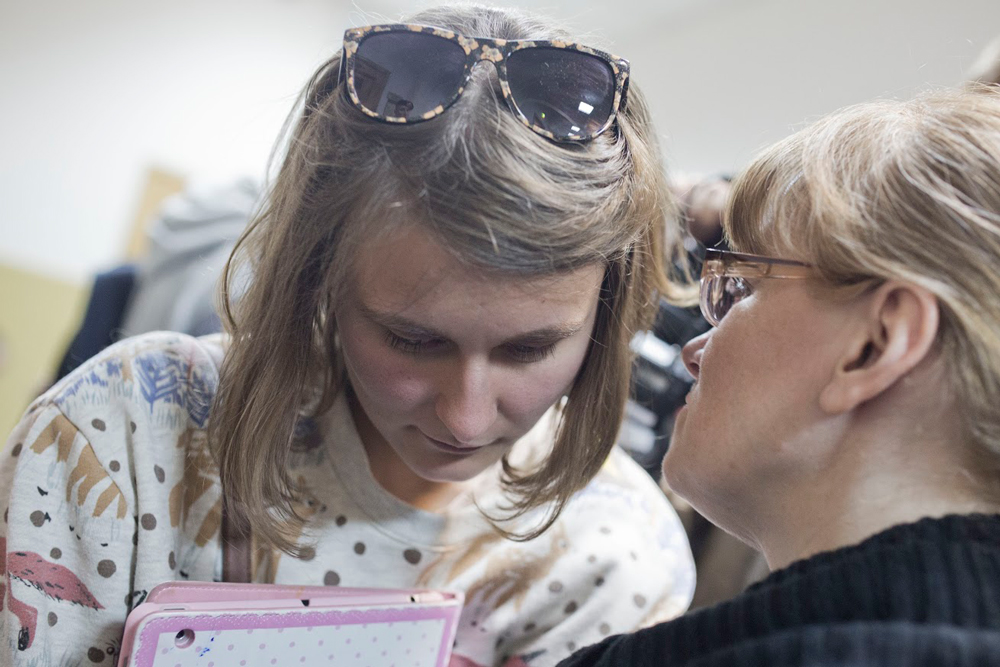 | Невеста Гаскарова Анна Карпова (слева) и его мать Ирина Константиновна (справа) в здании Басманного суда. 29 апреля 2013 г. |