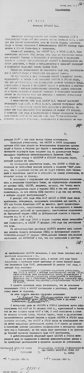 Письмо Генерального прокурора СССР Романа Руденко и председателя КГБ при СМ СССР Ивана Серова Первому секретарю ЦК КПСС Никите Хрущеву о деле бывших лидеров Польского Бунда и членов Исполкома II Интернационала Виктора Альтера и Герш-Вольфа Эрлиха.