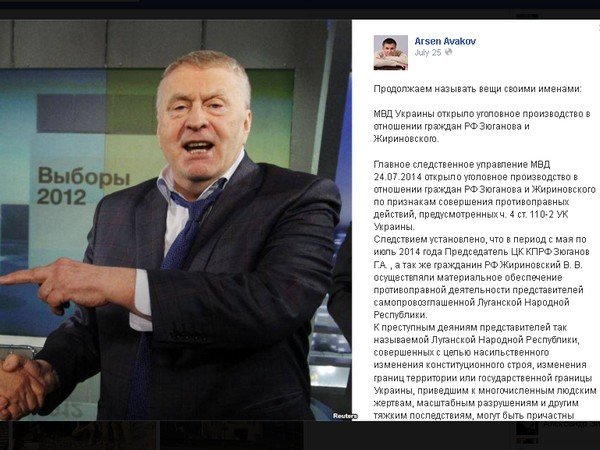 Со страницы Арсена Авакова В субботу, 2 августа, МВД Украины вызвало на допрос российских граждан, подозреваемых в финансировании и организации незаконных вооруженных формирований на территории Украины, сообщает УНИАН. Послу РФ на Украине Михаилу Зурабову было направлено письмо, в котором сообщается о вызове депутатов Госдумы РФ Владимира Жириновского, Геннадия Зюганова и Сергея Миронова, министра обороны РФ Сергея Шойгу, а также совладельца инвестфонда Marshall Capital, миллиардера Константина Малофеева.