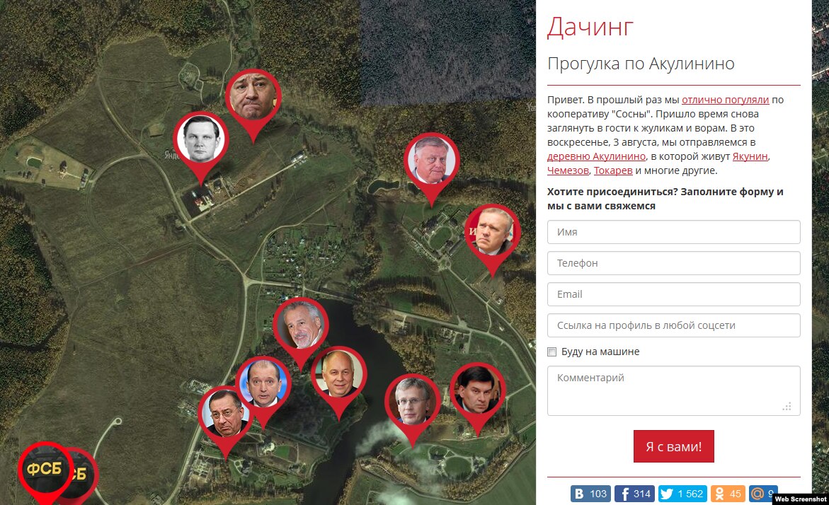 В Акулинино, по данным Фонда, находятся дачи главы Российских железных дорог Владимира Якунина, гендиректора "Ростеха" Сергея Чемезова, президента "Транснефти" Николая Токарева, одного из руководителей ФСБ Сергея Беседы, предпринимателя Аркадия Ротенберга.