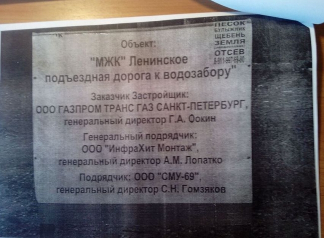 Согласно информации на щите, украсившем лес во время строительства дороги, она обозначена как «Подъездная дорога к водозабору малоэтажного жилого комплекса «Ленинский». Заказчик — ООО «Газпром Трансгаз», генподрядчик — ООО «ИнфраХит Монтаж». Кстати, МЖК «Ленинский» действительно существует. Расположен он как раз неподалеку от коттеджного поселка премиум-класса San-Repino. Но почему при этом служебный подъезд к водозабору превратился в двухполосное шоссе?
