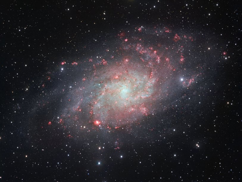 Нынешний снимок собран из большого количества фотографий, причем некоторые из них были сделаны через фильтр, пропускающий только красноватое излучение водорода. Это позволило сделать заметными газовые облака в спиральных ветвях галактики. В галактике Треугольника есть ряд интересных для ученых объектов. Например, в одной из ветвей спирали находится эмиссионная туманность NGC 604.