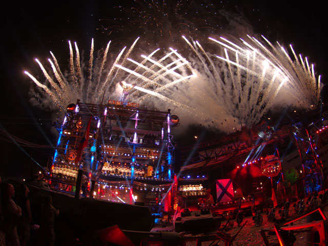 Впрочем, судя по резонансу в соцсетях, не побывавшей на празднике сетевой публике концерт запомнился по фото от "Вестей.ру". На момент написания заметки фото служит анонсом прямой трансляции мероприятия, которое прошло в пятницу вечером: видно свастику, составленную из актеров в черном. Что она символизирует и в какой момент концерта появилась на сцене, не уточняется. Происходящее называют "грандиозным байк-шоу".