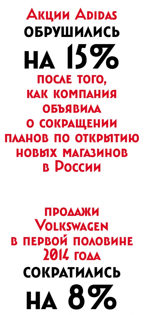 Однако бои «за» и «против» Путина шли не только в Германии — по всему ЕС. Если страны Южной и Центральной Европы ратовали за продолжение дипломатических игр с Россией, то Север и Восток были сторонниками жесткого диалога с Москвой. Резоны «стран последнего шанса» были также экономические: по оценкам специалистов, уже в этом году европейский ВВП уменьшится на 0,9 %, а в 2015-м — еще на 0,3 %. Ожидаемый рост производства в 1,6 % вряд ли достигнет и половины этой цифры. По словам президента франко-российской торгово-промышленной палаты (CCIFR) Эммануэля Киде, в одной только Франции под угрозой могут оказаться 300 тыс. рабочих мест. Западные компании уже стали сообщать о падении продаж в России: так акции Adidas обрушились на 15 % после того, как 1 августа компания объявила о сокращении планов по открытию новых магазинов вдвое; продажи крупнейшего европейского автопроизводителя Volkswagen в первой половине 2014 года сократились на 8 %, о проблемах на российском рынке сообщили Siemens и Metro. Лондонская биржа тем временем запретила IPO российских компаний, приостановив IPO «Башнефти» и «Детского мира» (впрочем, на российские компании приходится лишь 1 % акций, торгуемых в Сити).