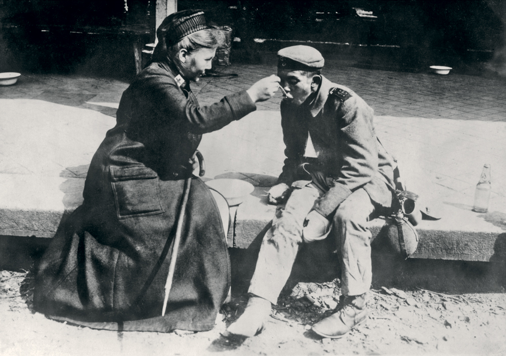 Медсестра французского Красного Креста помогает раненому. Германия, 1914–1918 гг.