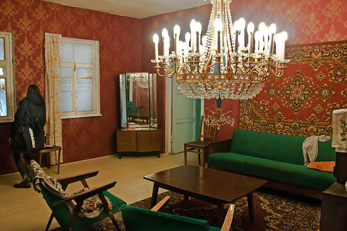 В рамках биеннале современного искусства Manifesta 10, которая сейчас проходит в Петербурге, в одном из парадных залов Эрмитажа японский художник Тацу Ниси соорудил «русский дом» — используя оригинальную люстру Зимнего дворца, он воссоздал интерьер русской советской квартиры с кружевными салфетками, энциклопедиями по садоводству и трильяжем. Ниси стал известен как раз своими инсталляциями, созданными в разных городах вокруг известных скульптур и архитектурных элементов. Например, японец использовал в своих работах фрагмент швейцарского собора XIV века, статую Христофора Колумба на Манхэттене, статую королевы Виктории в Ливерпуле. Смысл его произведений — в смене контекста, в котором существуют объекты культурного наследия.