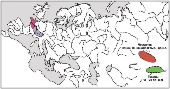 2. Тохарская миграция. В самом конце XIX века в бассейне Тарима в Синьцзяне были открыты рукописи VI–VIII веков, написанные индийской письменностью, но на каких-то иных языках, которые удалось распознать как индоевропейские, но не индоарийские. Эти языки, очень схожие с западными индоевропейскими, индийцы называли тохарскими. Когда стали определять положение тохарских языков в индоевропейской системе, оказалось, что они отделились от индоевропейского корня вторыми, сразу после хеттских. Арийские (индоарийский, иранский) и родственные им греческий и армянский отделились уже потом. Значит, если найти место отделения тохаров, то это также может помочь определить прародину всех индоевропейцев.
