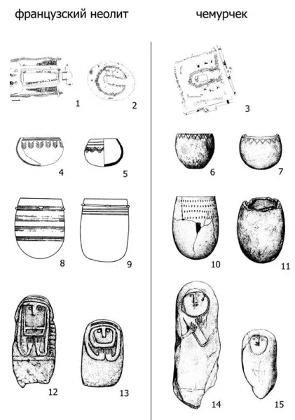 Неолит Франции – это ближайшее западное соседство культуры воронковидных кубков Северной Германии, Ютландии и Польши. Во Францию заходит ее западный отпрыск михельсбергская культура. В бассейне Тарима и в последующие времена продолжало существовать население с европейскими антропологическими характеристиками, носившее одежду из шерстяных тканей с клетчатым узором (излюбленный тип ткани у кельтов) и плащи с наплечной застежкой-булавкой, из которой в Европе развилась фибула.