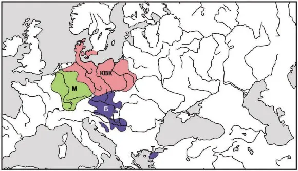 Баденская культура по традиции считалась развившейся из местных дунайско-карпатских культур предшествующего времени: Чернавода I и III; из нее — Болераз (протобаденская); а уж из нее — Баден. Такая традиция отражена в работах В.С. Титова (2000). Но еще в 1959 году чешский археолог Эвжен Неуступны детально разработал другую культурную линию, выведя баденскую культуру из культуры воронковидных кубков и проследив пять этапов изменения керамики (Neustupny 1959). Возможно, корни баденской культуры (как и любой археологической культуры) различны, но с какими из них была сопряжена языковая преемственность, археология не может поведать. Более обоснованной мне представляется линия от культуры воронковидных кубков, потому что она позволяет увязать хетто-лувийцев с общим корнем индоевропейцев. Культура воронковидных кубков Северной Европы конца V–IV тыс. до н. э., как известно, давно выдвигается на эту роль. Возможность вывести из нее хеттов в середине IV тыс. до н. э. усиливает эту версию.