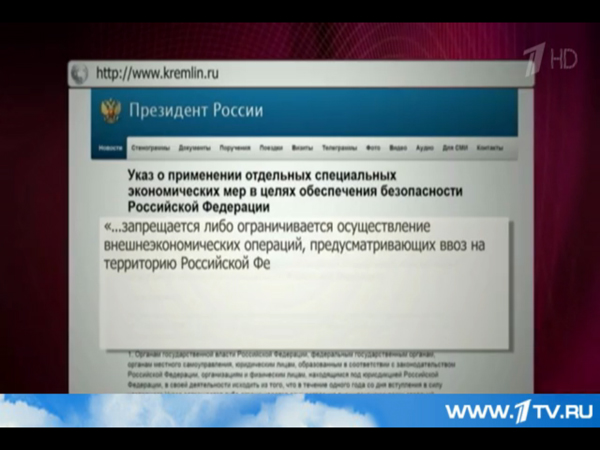 В ответ на это президент Владимир Путин 6 августа подписал указ о запрете импорта сельскохозяйственной продукции, сырья и продовольствия из стран, которые ввели санкции против России, а уже 7 августа федеральное правительство выпустило постановление, в котором были перечислены продукты, которые попадают под запрет. В итоге были запрещены поставки говядины, свинины, птицы, молока и молочных продуктов, фруктов и овощей из стран ЕС, США, Австралии, Канады и Норвегии. Ограничения были введены сроком на один год.