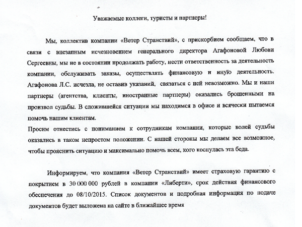 По данным следствия, в ночь на 13 августа 2014 года гендиректор ООО «Ветер странствий» вылетела в Ригу и может находиться там и по сей день. Следователи настоятельно рекомендуют Агафоновой явиться в ГСУ по Санкт-Петербургу — в противном случае она может быть объявлена в международный розыск и заочно взята под стражу.