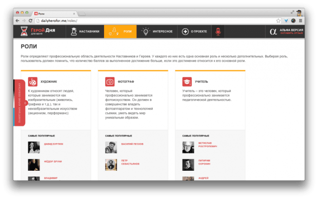 Сейчас проект находится в стадии альфа-версии, а в полной версии планируется реализация игровой механики, где каждый пользователь сможет повторить достижения наставников в реальной жизни.