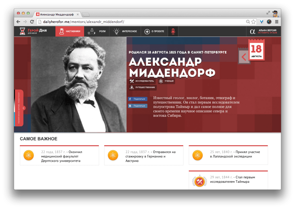 Образовательный проект «Герой дня», созданный Автономной некоммерческой организацией «Культурно-образовательный центр «Система вечных ценностей», ставит перед собой цель оживить в коллективной памяти выдающихся деятелей науки, искусства и истории, а также с помощью геймификации дать возможность пользователям стать учеником одного или нескольких Наставников, повторить их достижения в реальной жизни и рассказать об этом своим друзьям. Предлагаем вашему вниманию интервью с авторами проекта, вы сможете узнать больше о проекте и планах проекта на будущее.