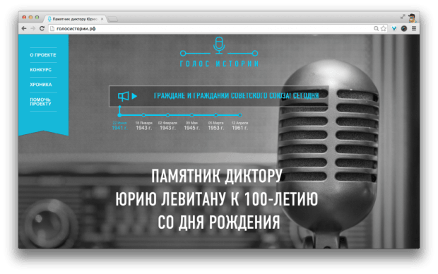 Дмитрий Козлов: Кроме сайта и групп в соцсетях, сейчас есть лекторий и программа по установке памятников. Не так давно был запущен проект установки памятника диктору Юрию Левитану, о котором подробнее можно узнать на «Голос истории». Познакомиться с первыми лекциями проекта «Герой дня» можно здесь и здесь.