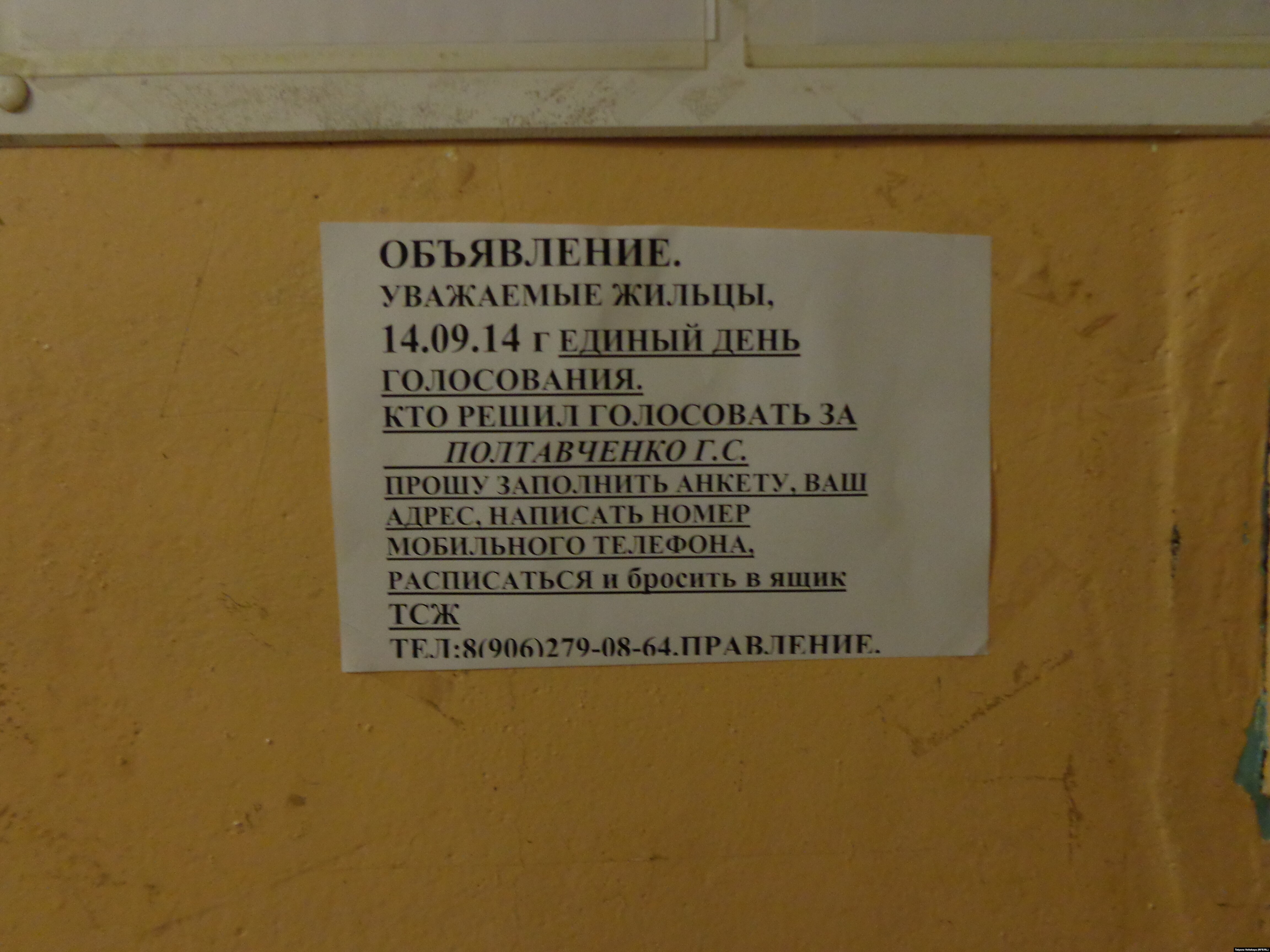 – У нас около дома – стройка. Строят трехэтажный торговый центр и начинали строить очень агрессивно. Шумели, били, включали экономию электроэнергии, и это было невыносимо. И мы писали прокурору, в Жилищную инспекцию. Но все это оставалось без ответа. Пока не написали губернатору. Реакция была мгновенной. У них сразу началась проверка. Я всегда говорю о заслугах людей. А человек, который вам сообщил об этом объявлении, – он недоброжелатель. А я его повесила и сообщила в нем, что тот, кто хочет голосовать в Единый день голосования за Георгия Полтавченко, должен заполнить анкету. Но, правда, никто не звонит. Я считаю, что реакция – обратная, хотя там есть и другие альтернативные кандидатуры, но мы их не знаем. Мы знаем Георгия Полтавченко в силу его теперешнего положения.