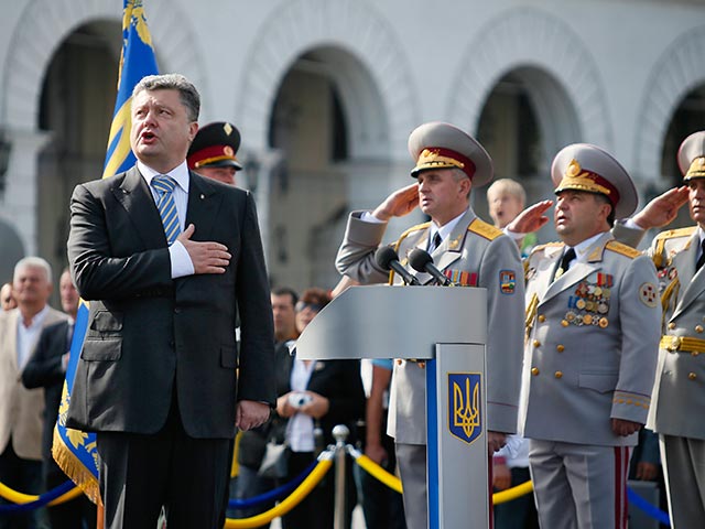 На Майдане Незалежности и Крещатике в Киеве проходит "парад войск" по случаю 23-й годовщины независимости Украины. Перед началом парада воины почетного караула отдельного президентского полка подняли флаг Украины. Торжества начались с исполнения государственного гимна Украины, с речью выступил президент страны Петр Порошенко. Военные парады на Украине не проводились с 2009 года. По данным NEWSru.Ua, прямо с парада военная техника отправится в зону силовой операции на восток страны.