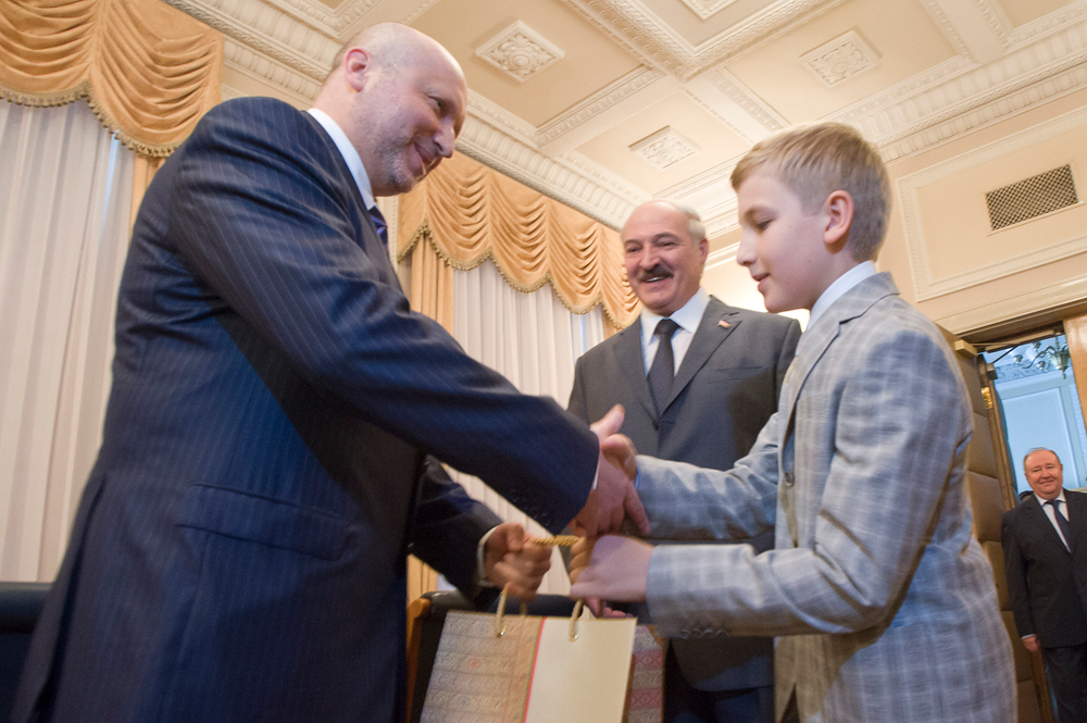 Александр Лукашенко не признал аннексию Крыма, зато признал новую киевскую власть (на снимке: во встрече со спикером Верховной Рады А. Турчиновым принял участие и Николай, сын белорусского президента). Киев, июнь 2014 г. /фото: Reuters