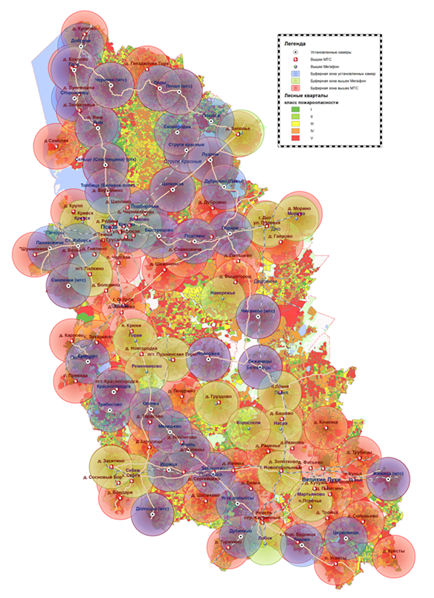 С использованием географических информационных технологий был проведен анализ пожароопасных лесных зон, на эти зоны наложена сеть вышек мобильных операторов, вокруг вышек построены буферные зоны видимости камер 25 км и выбрано оптимальное расположение камер.