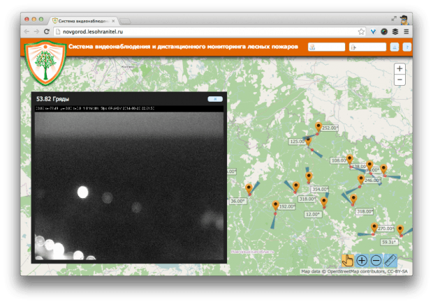 Данные доступны как в реальном времени, так и в архиве. По информации, полученной с камеры, рассчитывается местоположение очага пожара, наносится на карту Псковской области и о пожаре оперативно информируются соответствующие службы.