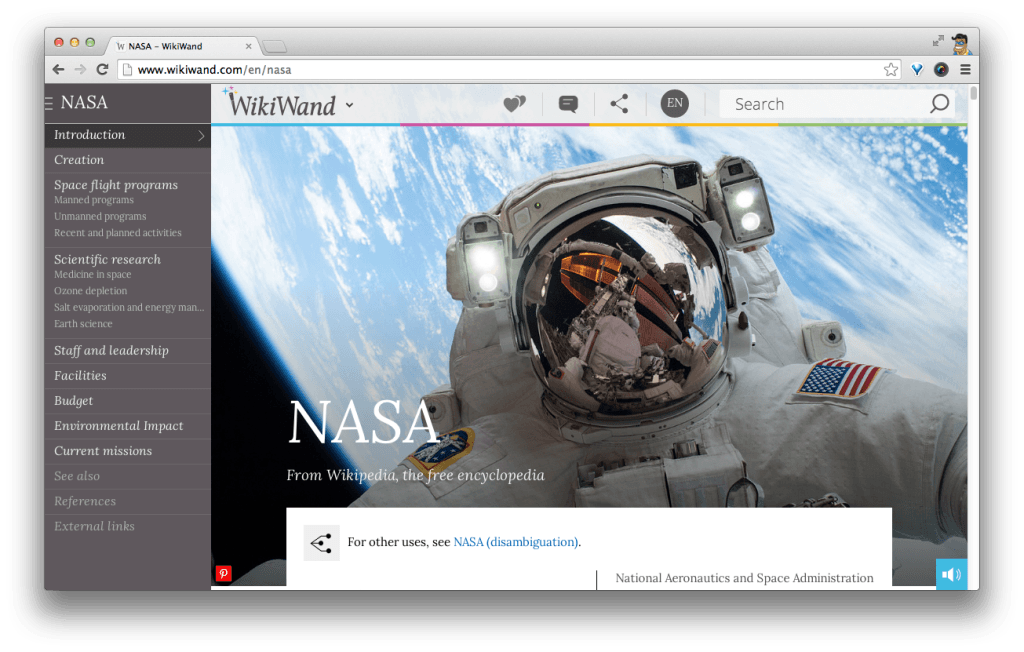 WikiWand дает возможность просматривать контент Wikipedia, используя новый дизайн и навигацию, а также увеличивает скорость загрузки материалов. Для лучшего использования рекомендуется установить расширение или приложение WikiWand для браузера Chrome.