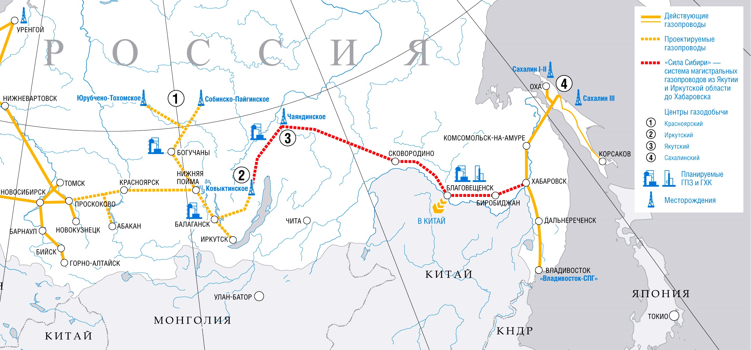 Согласно проекту, газопровод "Сила Сибири" будет проложен от Чаяндинского нефтегазоконденсатного месторождения в Якутии через Хабаровск до Владивостока, причем в районе Благовещенска от него будет сделано ответвление в Китай. Также к "Силе Сибири" планируется подключить и перспективное Ковыктинское газоконденсатное месторождение, расположенное в Иркутской области. Общая проектная мощность газопровода составляет 61 миллиард кубометров газа в год – и это при том, что пока Китай намерен закупать ежегодно только 38 миллиардов кубометров.