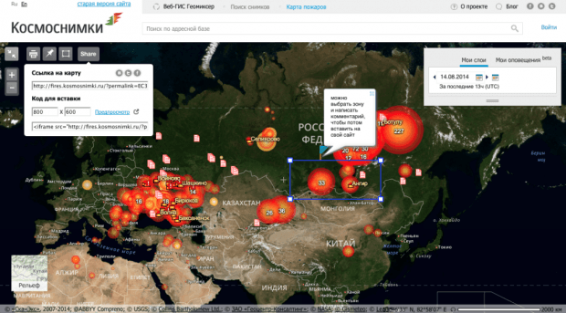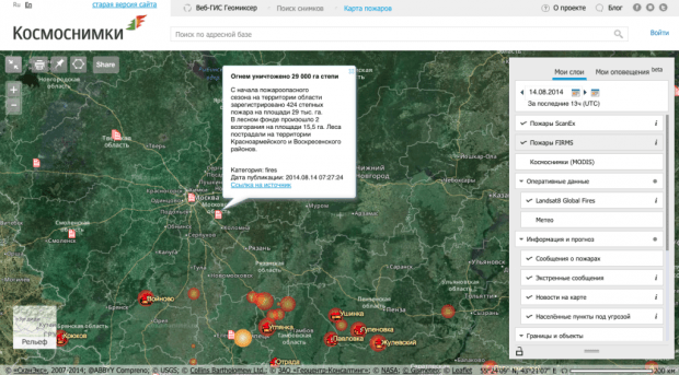 «Космоснимки — Пожары» дает возможность проводить оперативный мониторинг природных пожаров на территории России с помощью спутниковых снимков. Главная цель сервиса — доведение результатов мониторинга до широкого круга пользователей.
