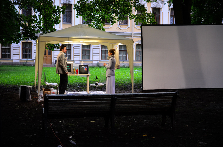 На двух экранах — два неприлично открыточных заката, а потом Петербург с высоты птичьего полета. Зрители таятся в листве — в палатках, расставленных кружком, что создает внезапный эффект Грушинского фестиваля. В опытный театроведческий глаз набегает слеза — непрошеная тем более, что это новый спектакль Дмитрия «Я-люблю-Джона-Кейджа» Волкострелова по тексту Павла «Я-не-люблю-сантименты-и-нарратив» Пряжко. Чтобы механистичные, похожие на бесперебойно качающиеся туда-сюда настольные мобили волкостреловские постановки вызывали эмоции — такие случаи критики могут пересчитать по пальцам. Первым, пожалуй, был двухлетней давности соло-проект в Доме ветеранов сцены, заказанный фестивалем «Территория» и показанный один-единственный раз.