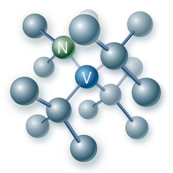 N-V центр в алмазе, сформированный атомом азота (замещающим атом углерода) и находящейся рядом вакансиейДля того, чтобы реализовать полномасштабный квантовый компьютер, превосходящий по производительности любой классический компьютер, помимо внутренних характеристик, необходимо создать для его оболочки такой материал, который позволил бы ему не разрушаться в окружающей среде. Одним из самых перспективных материалов, по мнению ученых, стал алмаз - он начал использоваться для квантовых вычислений относительно недавно. В алмазах, помимо атомов углерода, обычно также присутствуют атомы примесей. Чем больше примесей в камне, тем меньше он ценится ювелирами, но больше физиками и технологами. Трещины внутри драгоценного камня - точечные дефекты - представляют собой «неправильные» узлы кристаллической решётки — вакансии. Они возникают при удалении атома углерода из узла решётки и связываются с атомами азота. Такие дефекты также называются азотозамещёнными вакансиями или NV-центрами (от англ. nitrogen-vacancy). В эти вакансии в алмазе возможно инкрустировать механизмы квантового компьютера - тем самым изолировав их от внешнего воздействия. Находящиеся в механизмах наименьшие единицы компьютеров называются кубиты - они являются спином (результатом импульса) ядра азота и неспаренного электрона каждого NV-центра.