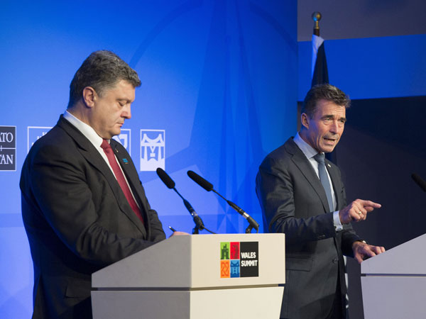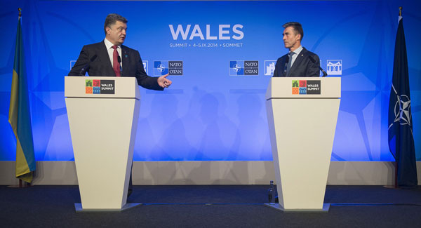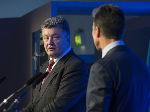Петр Порошенко и Андерс Фог Расмуссен «Мы договорились, что наше дальнейшее сотрудничество будет направлено на достижение полной совместимости между Украиной и НАТО и разработку совместных возможностей в военном, оборонном секторе и секторе безопасности», - заявил Порошенко и добавил, что интенсивное сотрудничество с альянсом в этой сфере будет укрепляться с помощью программ развития и наращивания потенциала ВС Украины и других силовых структур.