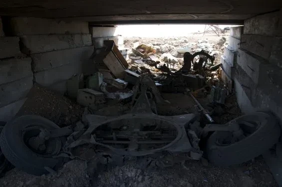 На западной окраине поселка, на обгоревших холмах, усеянных осколками мин, обнаруживаем укрепрайон, который во время боев был оставлен бойцами добровольческих батальонов «Азов» и «Шахтерск». Вырытые экскаватором блиндажи перекрыты железными плитами. В одном из них находим остатки пулемета Владимирова.