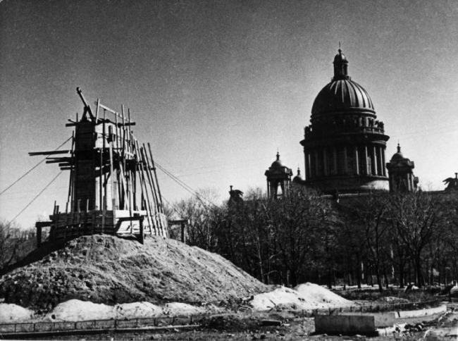 Замаскированный памятник Петру Первому на пл. Декабристов (Сенатская пл.)