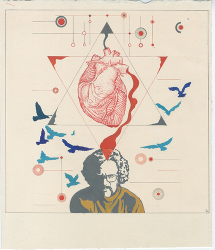 © Из собрания семьи Юрия Соболева Воздух Глядя на его изобразительное искусство, думаешь, что нет несочетаемых вещей — потому что все может оказаться связанным, нужно только найти эти нити-ходы. Тогда «Воздух» над рисунком-автопортретом может и шуршать крыльями птиц, и «мигать» какими-то линиями и точками, как силовыми векторами, и мозг очень наглядно соединяется с огромным сердцем (все от головы, говорите? или по наитию?). Причем в зависимости от того, в каком порядке эти образы читать, смысловые акценты, сюжетная линия могут чуть измениться. Модульную сетку, которую часто видишь в его графике, сам Соболев, как вспоминала Марина Перчихина, называл «“нулевой слой” — эта сетка и проецировала загадочные точки на любое из изображений и особенно в пустые белые зоны листа. Сетка основывалась на схеме построения сидящего Будды. Это потом стало неважно, но все же остается очень значимым для того, чтобы попытаться понять роль С. в независимом искусстве и специфику его как бы отсутствия в ныне появившейся историографии андеграунда. Он изначально “не местный” и принадлежал, более чем к замкнутой ситуации советского андеграунда, к общему европейскому движению со всеми свойственными интеллектуалам Запада паломничествами в страну Востока. Модульной сеткой его жизни можно назвать другой источник — дзенские стадии пути к просветлению, известные как Oxherdering pictures: оттуда приходили и названия работ “Поиски Быка”, и названия некоторых проектов уже группы “Запасный выход”, как, например, “Возвращение домой”».