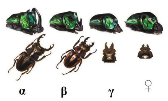 У альфа-самцов размер рогов/челюстей/шипов самый большой и соотносится с длиной тела, у бета-самцов размеры этих приспособлений меньше и аллометрические соотношения между ними и длиной тела нарушены, гамма-самцы внешне напоминают самок. Очевидно, разные морфы используют различные тактики размножения (борьба/охрана, тайное проникновение и мимикрия под самку).
