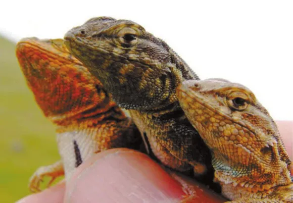 Стратегия «камень — ножницы — бумага» свойственна не только пятнистобоким игуанам. Барри Синер-во и его коллеги обнаружили ее у европейской живородящей ящерицы Lacerta vivipara. У нее, как и у игуаны, три аллеля одного гена (O,Y,W) определяют цветовые морфы самцов и стратегию их поведения, а также массу, размер тела и выносливость ящериц. (Выносливость рептилий тестировали на беговой дорожке, которая двигалась со скоростью 0,5 км/ч.) L. vivipara, гомозиготные по этим аллелям, имеют, соответственно, оранжевые, желтые или белые животики. Гетерозиготы порождают вариации с полосками и пятнышками.